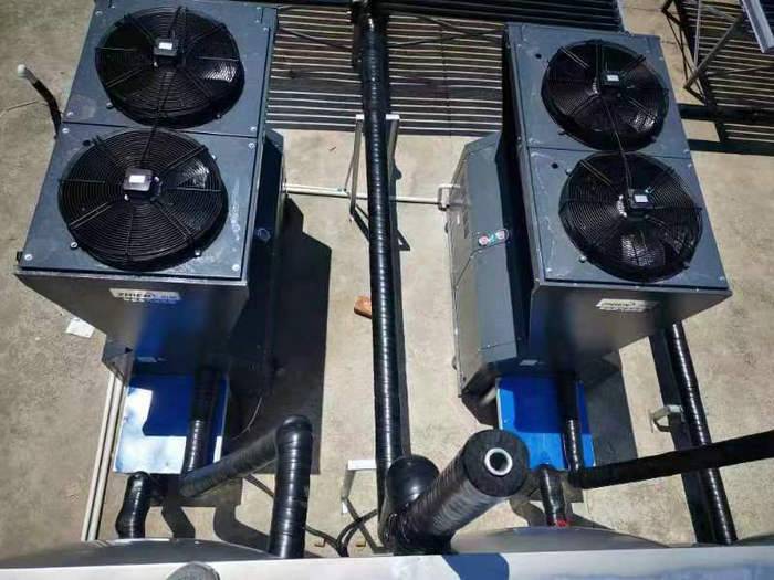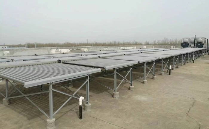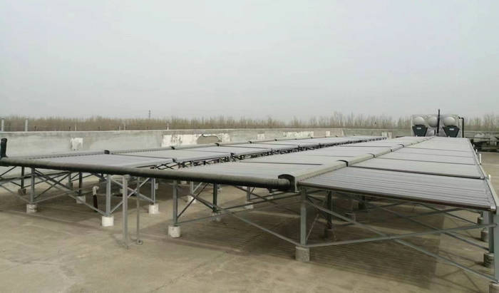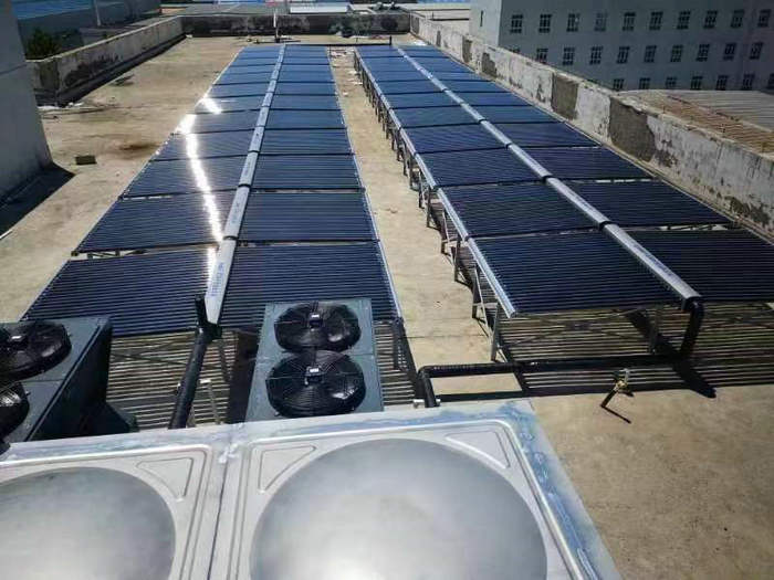 天津东马圈雍福悦园区工厂宿舍热水系统为12吨的热水项目:采用了两台10P空气能低温机(ZN-DKFDX-120ll)十24组太阳能集热器(58*1800*50)+12吨方形不锈钢热水保温水箱。