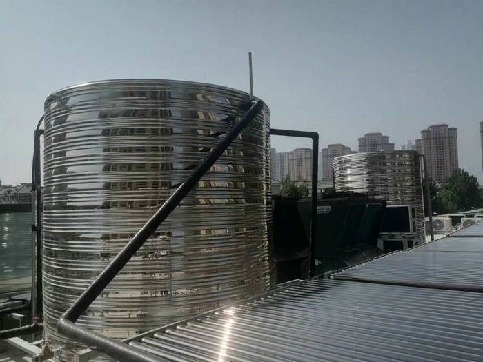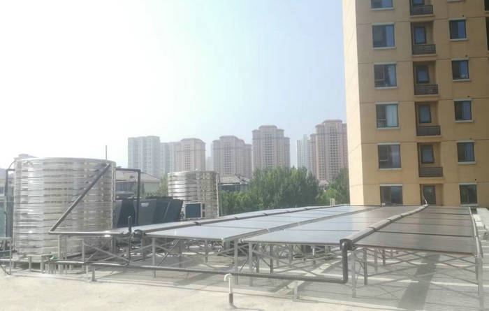 河北一酒店热水项目采用了太阳能+空气能热水系统。16组太阳能集热器+2台15匹智恩空气能热水机(ZN-DKFDX-150ll)+两个8吨圆形不锈钢保温水箱。